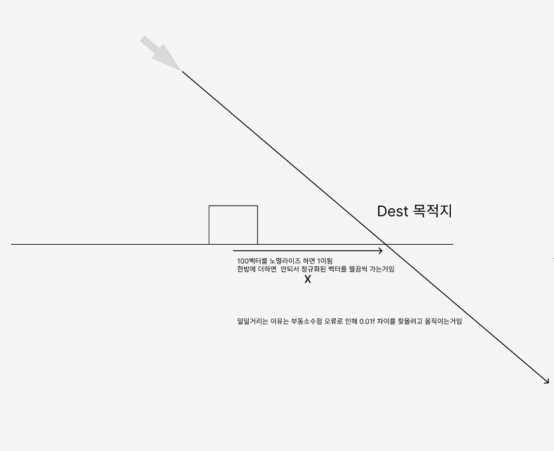그러하여 dir 값(목적지)은 목적지 빼기 현재위치인데
